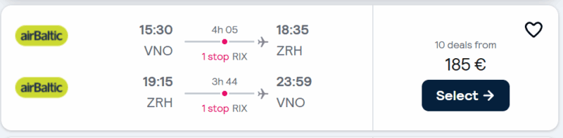 Skrydis pirmyn: Vilnius – persėdimas – Ciurichas