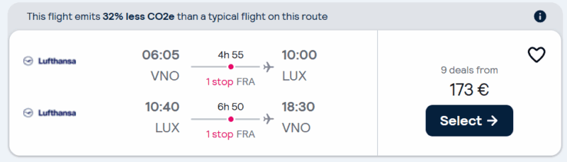 Skrydis pirmyn: Vilnius – persėdimas – Liuksemburgas
